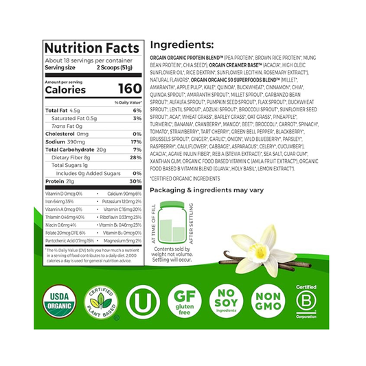 Orgain Organic Vegan 21g Protein Powder + 50 Superfoods Plant Based Vanilla Bean