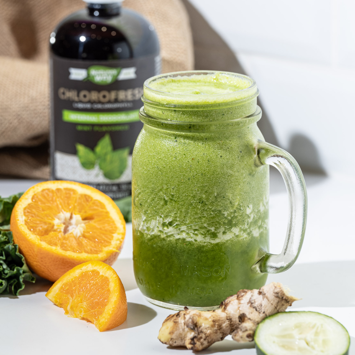 Smoothie Detox, una combinación perfecta de ingredientes naturales diseñado para limpiar y energizar tu sistema. Con kale, piña, pepino, clorofila, jugo de naranja natural y jengibre fresco, este jugo es una explosión de nutrientes que promueven la desintoxicación y la salud digestiva