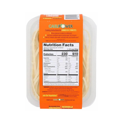 Pasta tipo linguine elaborada a base de coliflor, ofreciendo una textura suave y perfecta para tus recetas favoritas. Lista en minutos, es una opción deliciosa y más ligera que la pasta tradicional.