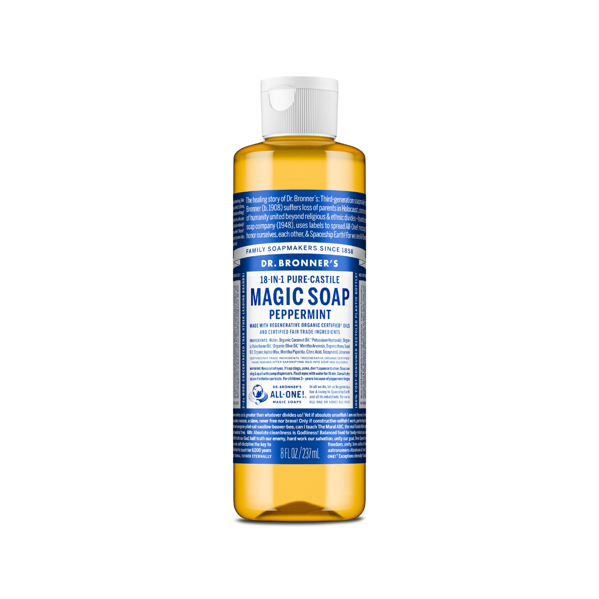 Los jabones puros de castilla 18 usos en 1 de Dr. Bronner son buenos para casi cualquier tarea de limpieza. Rostro, cuerpo, cabello, alimentos, vajilla, ropa, trapear, mascotas: limpie su casa y su cuerpo sin conservantes sintéticos, detergentes o agentes espumantes, ¡ninguno!