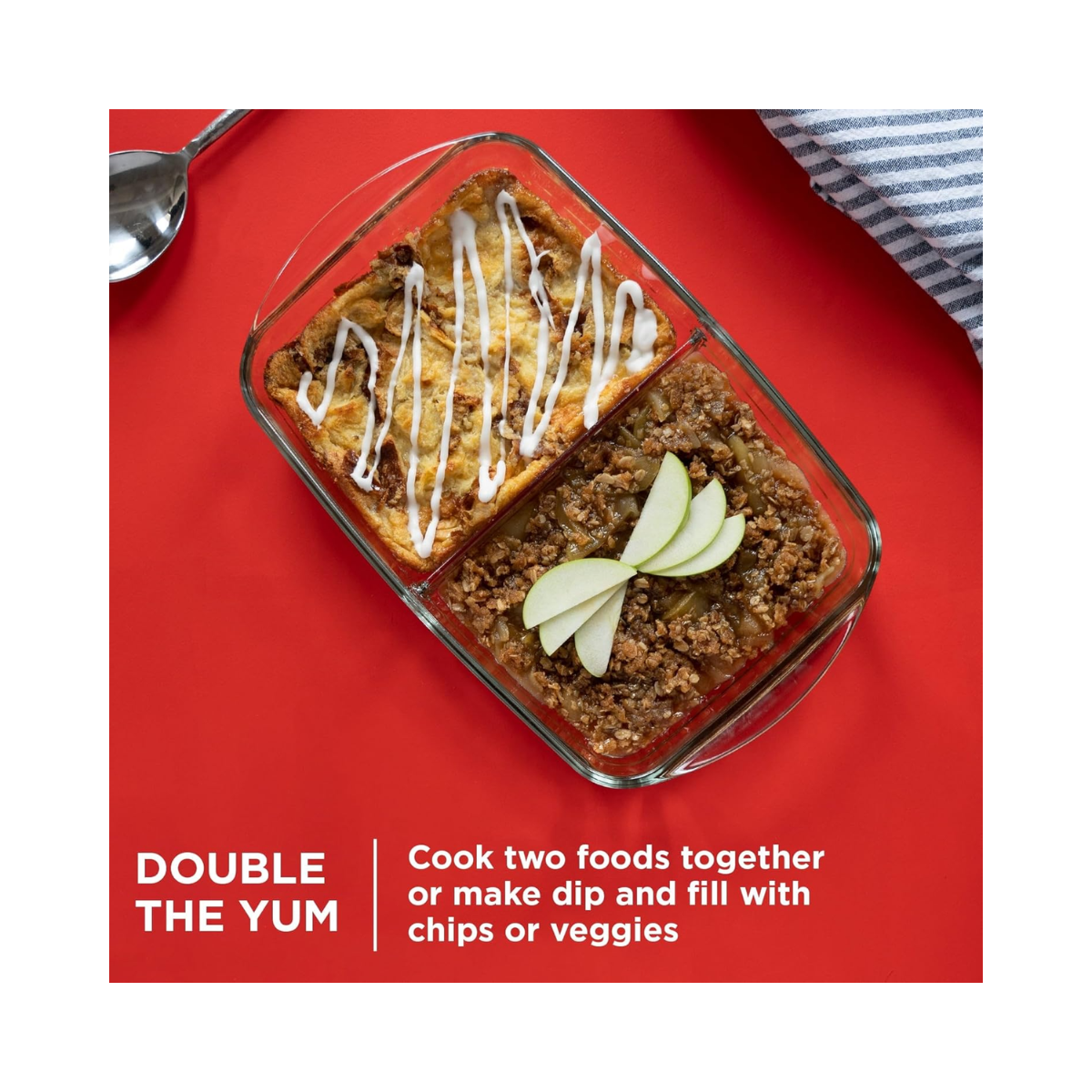 Fuente de vidrio templado resistente 8"x12" con compartimento dividido para cocinar, hornear o servir dos preparaciones a la vez. Ideal para lasañas, guisos, brownies o platillos combinados sin mezclar sabores. Su vidrio durable resiste cambios de temperatura y es apto para horno, refrigerador, congelador y lavavajillas. Diseño práctico que facilita porciones y presentación.