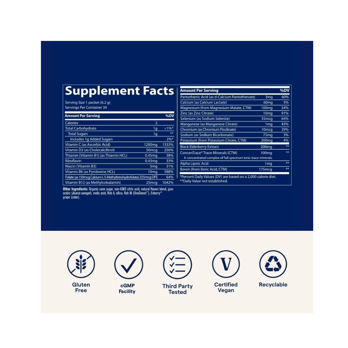Mezcla efervescente sabor frambuesa que aporta una potente combinación de 1.200 mg de vitamina C, sobre 70 minerales traza, electrolitos clave (potasio, magnesio, sodio) y sin cafeína ni estimulantes artificiales. Ideal para reponer energía, mejorar hidratación y combatir fatiga tras entrenamientos o largos días activos. Formato práctico de 30 sobres para mezclar fácilmente.